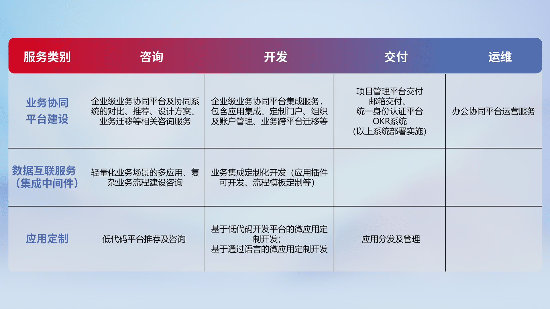 针对钉钉、、企微、、、IDaas等平台级产品提供产品的规划、、方案、、交付、、定制化开发等服务,,,实现如统一协同办公、、智能客户服务、、、、混合会议管理、、、、智能数据查询、、、、等业务场景,,实现数字化转型。。。